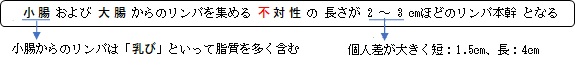 したがって、腸リンパ本幹の下部は腸間膜内を走りますが、腰部で乳び槽に向かうあたりからは腹腔後方に移動します。