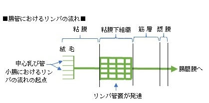 中心乳び管( ちゅうしんにゅうびかん、英:central lacteal ) ・概 要 ・参考となるサイト 【概 要】 ・中心乳び管は小腸におけるリンパの流れの起点となっている。 ・粘膜固有層の結合組織に包まれている。 ・絨毛の長さが約0.5~1.5㎜ほどで、その中央を走る中心乳び管の長さはおよそ0.5~1.0㎜ほどとなる。(by ChatGPT) ・脂質の輸送経路 : 中心乳び管 ⇒ リンパ管 ⇒ 胸管 ⇒ 鎖骨下静脈 ⇒ 全身の血流 その他の働きとして:「脂質以外にも、微量の蛋白質や免疫細胞もリンパ液として流れる」 (by ChatGPT) ■ 写真やイラストを掲載しているサイト ■ ・ イラストや写真を掲載しているサイト-Ⅰ ・ イラストや写真を掲載しているサイト-Ⅱ ・ イラストや写真を掲載しているサイト-Ⅲ ・ イラストや写真を掲載しているサイト-Ⅳ ・ イラストや写真を掲載しているサイト-Ⅴ