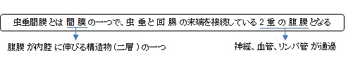 虫垂間膜( ちゅうすいかんまく、英:mesoappendix ) ・概 要 ・参考となるサイト 【概 要】 虫垂に関係する神経、血管、リンパ管のほとんどはこの間膜経由となる。よって、詳しくは「虫垂」の項を参照のこと。 ■ 写真やイラストを掲載しているサイト ■ ・ イラストや写真を掲載しているサイト-Ⅰ ・ イラストや写真を掲載しているサイト-Ⅱ ・ イラストや写真を掲載しているサイト-Ⅲ