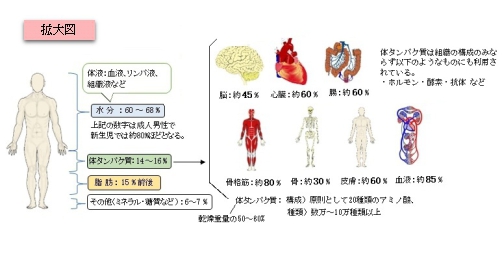 機 能 : 生命活動維持機能(消化酵素、代謝酵素など)、体内環境維持機能(物質の輸送・貯蔵:ヘモグロビン、アルブミンなど)