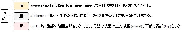 体 幹(解剖学) ( たいかん、英:trunk ) このサイトは、基本的に「日本人体解剖学 (上巻) 」に沿って作成している。しかし、「人体の区分」に関しては、他のほとんどのサイトなどがそうであるように、体幹から「頭部・頚部」を切り離して考えている。 具体的には以下の3つとなる。※「日本人体解剖学 (上巻) 」を参考に作成。 このサイトでは、「人体の区分」を以下のように大きく3つに分けて考えている。 ちなみに、以下が「日本人体解剖学 (上巻) 」の人体の区分になり、体幹に「頭」と「頚」を含めている。
