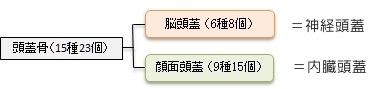 私たちの頭蓋を構成する骨(15種23個)は、主として脳を入れる脳頭蓋(=神経頭蓋)と顔面を構成する顔面頭蓋(=内臓頭蓋)の2つに大きく分けることができる。