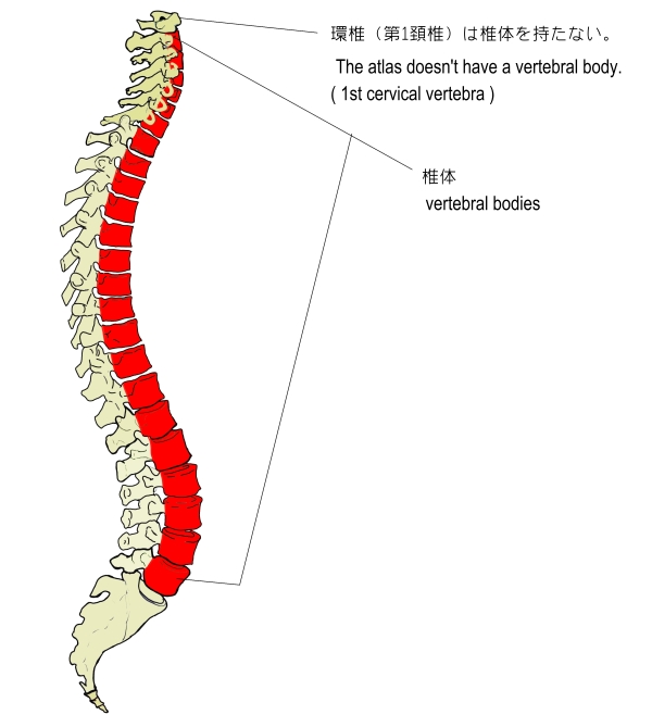 「椎体は椎骨の前部を占める短い円柱で、上下端は平らな面をつくる。上面と下面はやや広いため、椎体を側面から見ると、中央でややくびれている。後面は椎孔の前壁にあたり、縦に走る浅く広い溝となっている。椎体の上下面は椎間円板と固着する硝子軟骨で被われる。この軟骨の周縁部は骨化し、後方部分が欠けた不完全な輪の形の骨端板を作る。加令によりこの骨端板の骨化はさらに進行し、椎体の上下面の縁が側面から水平に突出するようになる。」