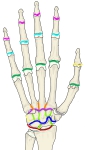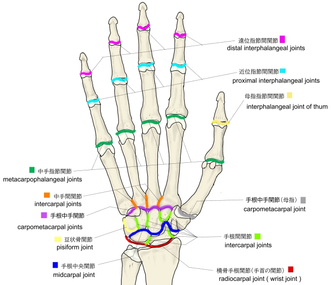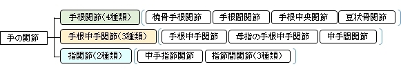」では、以下のように手の関節(articulations of hand)を大きく、手根関節、手根中手関節、そして指関節の3つに分けている。