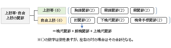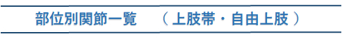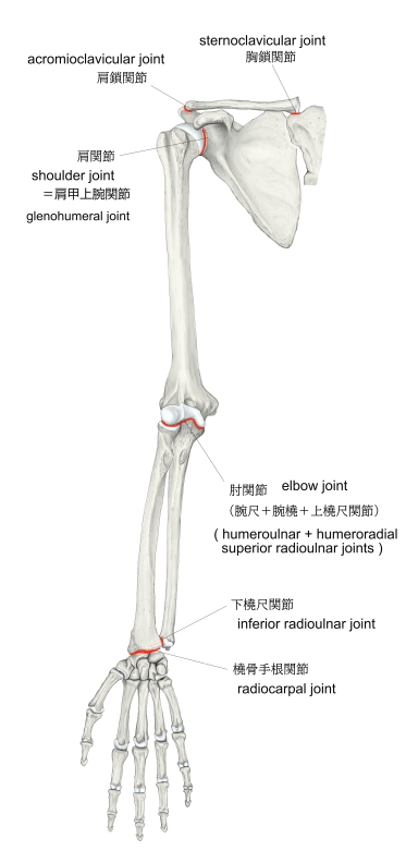 Ⅰ. 上肢帯 1 胸鎖関節(片:1、全:2) sternoclavicular joint 鞍関節 詳細 2 肩鎖関節(片:1、全:2) acromioclavicular joint 半/平面関節 詳細 3 肩関節(片1:、全:2) =肩甲上腕関節 shoulder joint =glenohumeral joint 球関節 詳細 Ⅱ. 自由上肢 1 肘関節 (片:1,全:2) =腕尺関節+腕橈関節+上橈尺関節 joints of costal heads 複合関節 詳細 2 下橈尺関節(片:1、全:2) inferior radioulnar joint 車軸関節 詳細 3 橈骨手根関節(片:1、全:2) radiocarpal joint 顆状/楕円関節 詳細 頭蓋 脊椎・胸郭 下肢帯 自由下肢 手 足
