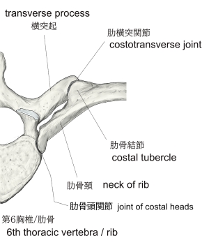 肋椎関節( ろくついかんせつ、英:costovertebral joints ) 詳しくはそれぞれの関節の解説ページを参照のこと。 以下は「デジタル大辞泉 」の解説文となる。 「胸椎と肋骨の間にある関節。胸椎の肋骨窩(ろっこつか)と肋骨頭の間にある肋骨頭関節と、胸椎の横突起と肋骨結節の間にある肋横突関節とがある。」