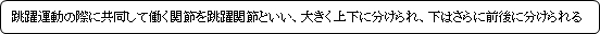 下後跳躍関節 (かこうちょうやくかんせつ、英:?) = 距骨下関節 「日本人体解剖学 (上巻) 」には以下のような解説が見られる。 「踵舟関節、距骨下関節および距踵舟関節は跳躍運動の際、協同して働くので、それぞれ上跳躍関節および下後跳躍関節および下前跳躍関節ともいう。」