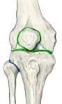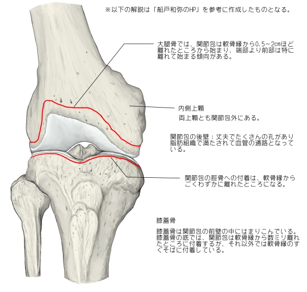 「関節包は大腿骨では軟骨縁から1/2~2cmへだたったところから起り,しかもその距りは一般に両側方および後方よりも前方で大きくなっている.大腿骨の両上顆は関節包の外にある.関節包は脛骨には軟骨縁からごくわずかへだたったところに付いている.膝蓋骨は関節包の前壁の中にはまりこんでいる.そして関節包は膝蓋骨の底では軟骨縁から数ミリメートル離れたところに付くが,ほかのすべての縁では軟骨縁のすぐそばに付いている.後壁は丈夫で孔がたくさんにあり,脂肪組織でみたされて血管の通りぬけるところになっている. 」