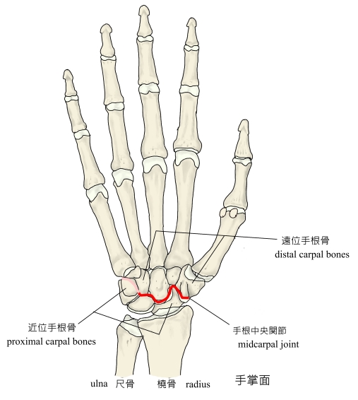 「手根中央関節は近位の舟状骨・月状骨・三角骨の下面遠位の大菱形骨・小菱形骨・有頭骨・有鉤骨の上面で構成される。2 列の間にはS 字状の空間がありその空間は次の2 つの部分に識別できる。