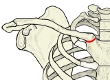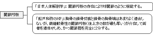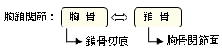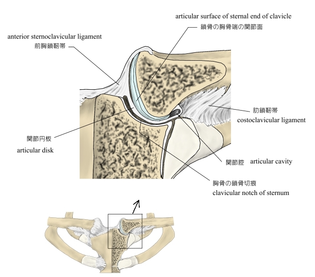 胸鎖関節 ( きょうさかんせつ、英:sternoclavicular joint ) 鎖骨の頬骨端にある胸骨関節面と胸骨の鎖骨切痕との間にできる鞍関節で、緩い関節包に包まれている。また、関節腔は関節円板によって2分されている。 「船戸和弥のホームページ」には以下のような解説が見られる。 「胸鎖関節は鎖骨の胸骨端と胸骨の鎖骨切痕との間の関節で、鎖骨の胸骨端が大きいために、関節面は第1肋軟骨の内側端上縁にまでおよんでいる。また、鎖骨胸骨端の上部は胸骨上縁より上方やや後方に突出する。胸骨と鎖骨の関節面の形は個人差が大きいが、一般的にいずれも浅い鞍状である。胸骨の鎖骨切痕と鎖骨の胸骨端はあまりよく適合しないが、線維軟骨性の関節円板(後上方の部が最も厚い)が介在して両者を適合せしめ、かつ関節腔を完全に2分する。 」 【 構成する骨 】 【 種 類 】 【 関連する靭帯 】 1 前胸鎖靭帯 anterior sternoclavicular ligament 2 後胸鎖靭帯 posterior sternoclavicular ligament 3 鎖骨間靭帯 interclavicular ligament 4 肋鎖靭帯 costoclavicular ligament 【他の参考となるサイト】 ・イラストや写真を掲載しているサイト-Ⅰ(断面のイラスト) ・イラストや写真を掲載しているサイト-Ⅱ(断面のイラスト) ・イラストや写真を掲載しているサイト-Ⅲ(関節円板の存在がよく分かるイラスト) ・イラストや写真を掲載しているサイト-Ⅳ(鞍関節の形状が分かるイラスト)