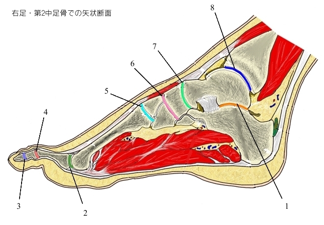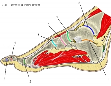 右足(矢状断面) 1 距骨下関節 subtalor j. 詳際 2 中足指節関節 metatarsophalangeal j. 詳細 3 遠位指節間関節 distal interphalangeal j. 詳細 4 近位指節間関節 proximal interphalangeal j. 詳細 5 足根中足関節 tarsometatarsal j. 詳細 6 楔舟関節 cuneonavicular j. 詳細 7 距舟関節 talonavicular j. 詳細 8 距腿関節 talocrural j. 詳細 ⇒ 名称付きイラスト 【関連イラスト】 右足(足背面) 右足(断面) 右足の骨(分割)