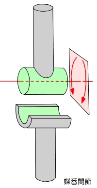 4. 蝶番関節: 両関節面が円柱面の一部を成す(蝶番状)もので、一方向の運動のみを示す。
