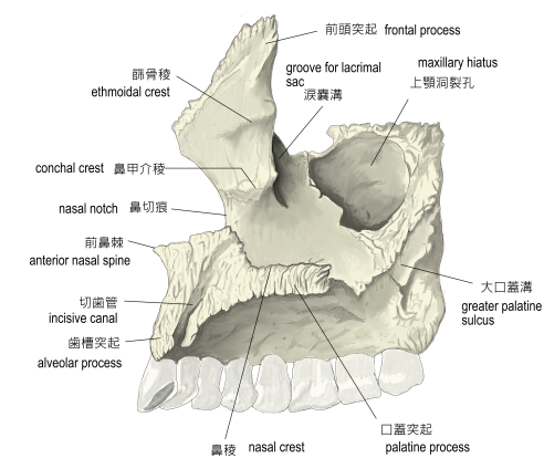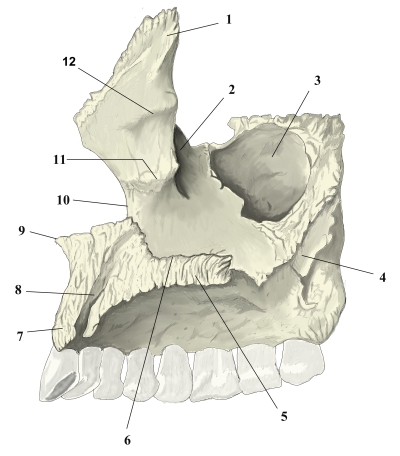 上顎骨(内側面) 1 前頭突起 詳細 2 涙嚢溝 詳細 3 上顎洞裂孔 詳細 4 大口蓋溝 詳細 5 口蓋突起 詳細 6 鼻稜 詳細 7 歯槽突起 詳細 8 切歯管 詳細 9 前鼻棘 詳細 10 鼻切痕 詳細 11 鼻甲介稜 詳細 12 篩骨稜 詳細 ⇒ 名称付きイラスト 【関連イラスト】 上顎骨(前面) 上顎骨(外側面) 上顎骨(上面) 上顎骨(底面) 頭蓋骨・横断面 (鼻腔下部)