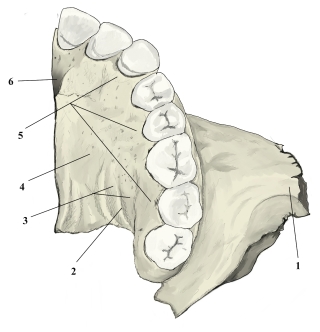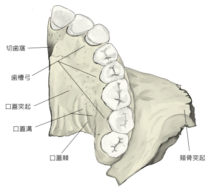 上顎骨(底面) 1 頬骨突起 詳細 2 口蓋棘 詳細 3 口蓋溝 詳細 4 口蓋突起 詳細 5 歯槽弓 詳細 6 切歯窩 詳細 ⇒ 名称付きイラスト 【関連イラスト】 上顎骨(前面) 上顎骨(外側面) 上顎骨(内側面) 上顎骨(上面) 頭蓋骨・横断面 (鼻腔下部)
