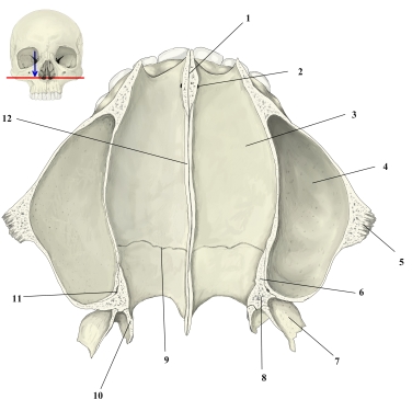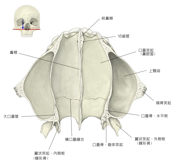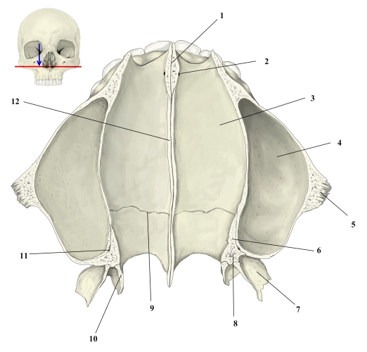 頭蓋骨・横断面(鼻腔下部) 1 前鼻棘 詳細 2 切歯管 詳細 3 口蓋突起(鼻腔面) 詳細 4 上顎洞 詳細 5 頬骨突起 詳細 6 口蓋骨・水平板 詳細 7 翼状突起・外側板 (蝶形骨) 詳細 8 口蓋骨・錐体突起 詳細 9 横口蓋縫合 詳細 10 翼状突起・内側板 (蝶形骨)) 詳細 11 大口蓋管 詳細 12 鼻稜 詳細 ⇒ 名称付きイラスト 【関連イラスト】 上顎骨(前面) 上顎骨(外側面) 上顎骨(内側面) 上顎骨(上面) 上顎骨(底面)
