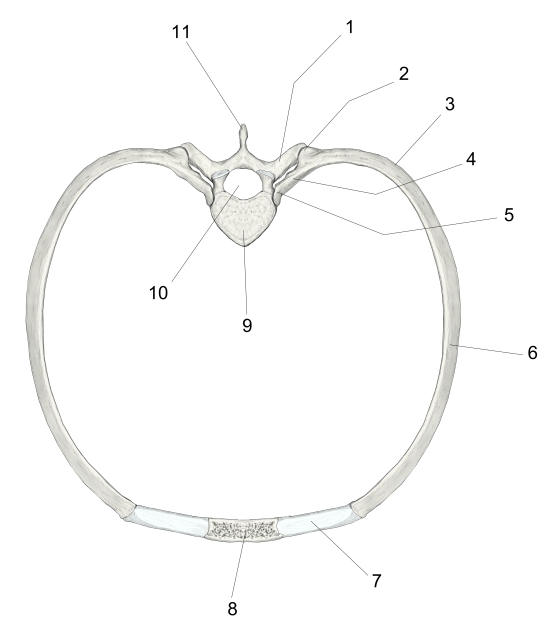 第6肋骨・胸椎(上面) 1 横突起 詳細 2 肋骨結節 詳細 3 肋骨角 詳細 4 肋骨頚 詳細 5 肋骨頭 詳細 6 肋骨体 詳細 7 肋軟骨 詳細 8 胸骨 詳細 9 椎体 詳細 10 椎孔 詳細 11 棘突起 詳細 ⇒ 名称付きイラスト 【関連イラスト】 右肋骨(上面) 右第1肋骨(上面) 右第2肋骨(上面) 右第5肋骨(上面) 典型的な肋骨(後部より) 胸郭(前面) 胸郭(後面)