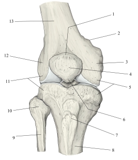 右膝関節周辺(前面) 1 膝蓋骨底 詳細 2 内転筋結節 詳細 3 内側上顆 詳細 4 膝蓋骨 詳細 5 内側顆 詳細 詳細 6 膝蓋骨尖 詳細 7 脛骨粗面 詳細 8 脛骨 詳細 9 腓骨 詳細 10 腓骨頭 詳細 11 外側顆 詳細 詳細 12 外側上顆 詳細 13 大腿骨 詳細 ⇒ 名称付きイラスト 【関連イラスト】 右膝関節(前面)