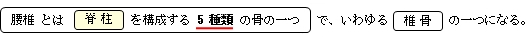 以下は腰椎に関する簡単な解説になる。 脊柱は以下の5種類の骨により構成され、腰椎は胸椎の下に位置する骨となる。 それぞれの腰椎は、上部から番号が若い数字が付されている。最上部のものが第1腰椎、その下のものが第2腰椎、そして最下部のものが第5腰椎となる。 「日本人体解剖学 (上巻) 「横突起に相当して、椎弓根の外側から横に突出する扁平な突起を肋骨突起 (costal process)といい、下位腰椎のものほど大きい。腰椎の肋骨突起は、元来この部の肋骨に相当するものである。」 「船戸和弥のホームページ」では以下のように解説している。 「腰椎の横突起は本来、この部の肋骨に相当するもので肋骨突起といい、本来の横突起は上関節突起の外側から後方に向かう小さな隆起として残っており、乳頭突起とよぶ。また、肋骨突起の根部の後面には下方に向かう小突起があり、副突起というのが、これも本来の横突起の一部が変形したものである。」 そして、「日本人体解剖学 (上巻) 「肋骨突起の根部の後面にある小さな棘状隆起を副突起という。副突起は本来の横突起が変形したもので、筋の付着点となる。また、乳頭突起の一部も横突起の変形したものと言われる。」 ちなみに、以下は椎骨の典型的な形状となる。