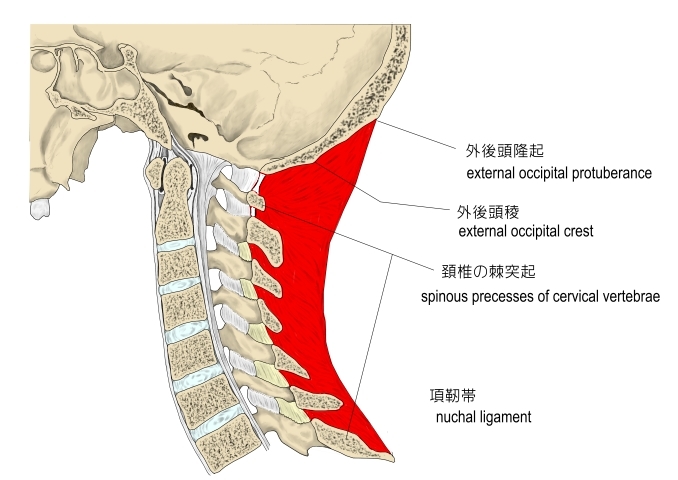 Function:In humans it is a tendon-like structure that has developed independently in humans and other animals well adapted for running.[2] In some four legged animals, particularly ungulates, the nuchal ligament serves to sustain the weight of the head.」