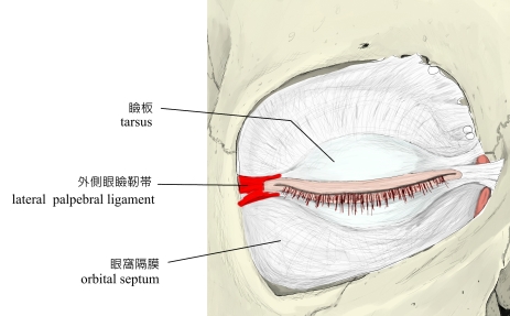 「上下の眼窩隔膜が合流して内側および外側眼瞼靭帯となり,眼輪筋も付いて眼瞼を支持する.」