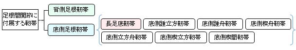 長足底靭帯(ちょうそくていじんたい、英:long plantar ligament) 足底の靭帯の中で最も表層にあり、かつ最も長い靭帯となる。 「船戸和弥のホームページ」には以下のような解説が見られる。 「そのほかの底側足根靱帯はこれにより下方から被われ、その間に粗な結合組織が介在する。踵骨隆起の下面から起こって前方に広がり、その深層の線維は立方骨の長腓骨筋腱溝の後の立方骨粗面に着く。浅層の線維は同腱の表面を越えて少なくも3束に分かれて中足骨底に着く。」 また、「Wikipedia」には以下のような解説が見られる。 「This ligament converts the groove on the plantar surface of the cuboid into a canal for the tendon of the fibularis longus.」 右足(足底面) 右足(足底面) 【 付着する骨 / 関節 】 【 他の参考となるサイト 】 ・イラストや写真を掲載しているサイトⅠ ・イラストや写真を掲載しているサイトⅡ ・イラストや写真を掲載しているサイトⅢ ・イラストや写真を掲載しているサイトⅤ ・イラストや写真を掲載しているサイトⅥ