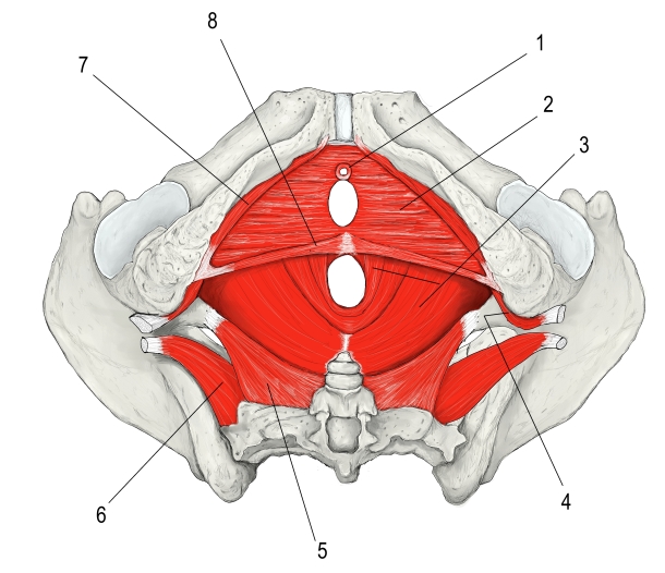 女性の骨盤底(底部より) 1 外尿道括約筋 詳細 2 深会陰横筋 詳細 3 肛門挙筋 詳細 4 内閉鎖筋 詳細 5 尾骨筋 詳細 6 梨状筋 詳細 7 坐骨海綿体筋 8 浅会陰横筋 詳細 ⇒ 名称付のイラスト 【関連イラスト】 女骨盤底筋群(上部より) 女骨盤底筋群(底部より) 女骨盤底筋群(底部より) 女骨盤底筋群(底部より)