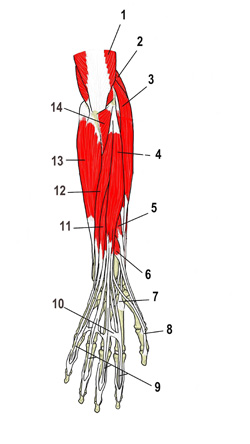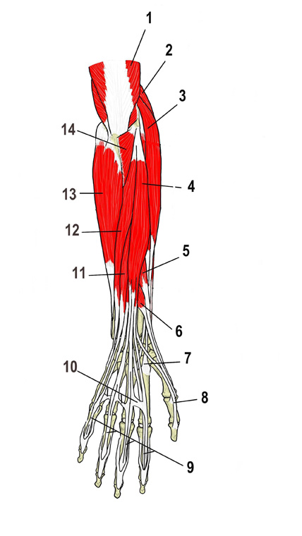 前 腕(後 面) 1 上腕三頭筋 詳細 2 腕橈骨筋 詳細 3 長橈側手根伸筋 詳細 4 (総)指伸筋 詳細 5 長母指外転筋 詳細 6 短母指伸筋 詳細 7 長橈側手根伸筋の腱 8 長母指伸筋の腱 9 (総)指伸筋の腱 10 腱間結合 11 小指伸筋 詳細 12 尺側手根伸筋 詳細 13 尺側手根屈筋 詳細 14 肘筋 詳細 ⇒ 名称付きのイラスト 【関連イラスト】 前腕(後面) 前腕(後面) 前腕、深層(後面) 前腕、深層(後面) 前腕(右側面)