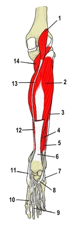 下腿部(後面) 1 足底筋 詳細 2 ヒラメ筋 詳細 3 長腓骨筋 詳細 4 長母趾屈筋 詳細 5 短腓腹筋 詳細 6 踵骨腱(アキレス腱) 詳細 7 短腓骨筋の腱 詳細 8 長腓骨筋の腱 詳細 9 長趾屈筋の腱 詳細 10 長母趾屈筋の腱 詳細 11 後脛骨筋の腱 詳細 12 長趾屈筋 詳細 13 足底筋の腱 詳細 14 膝窩筋 詳細 ⇒ 名称付きのイラスト 【関連イラスト】 下腿部(後面) 下腿部、深層(後面) 下腿部断面(最厚部)