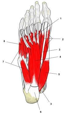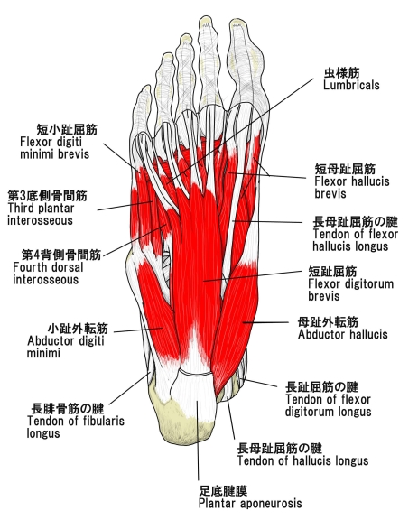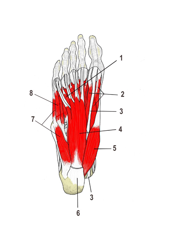 足(底) 1 虫様筋 詳細 2 短母趾屈筋 詳細 3 長母趾屈筋の腱 4 短趾屈筋 詳細 5 母趾外転筋 詳細 6 足底腱膜 ※途中切断 7 小趾外転筋 詳細 8 短小趾屈筋 詳細 ⇒ 名称付きのイラスト 【関連イラスト】 足(底) 足、深層(底) 足、深層(底) 斜め横端面