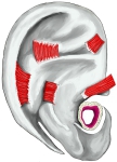 耳介の内側面の 耳甲介の裏にあたる隆起部と上部の凸状部間に張る。 |