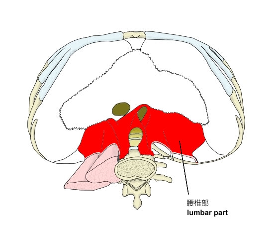 lumbar part 右脚と左脚よりなり、それぞれ内側脚と外側脚に分かれる。内側脚と外側脚の間を交感神経が走っている。 右脚と左脚は第1腰椎の上縁で交叉して大動脈裂孔を、そしてそのやや左より上方で食道裂孔を作る。この内側脚には裂け目があり、その間を大内臓神経、奇静脈(/半奇静脈)が通過している。裂け目の外側を中間脚と呼び、小内臓神経が走っている。 |