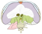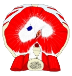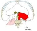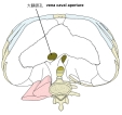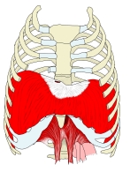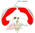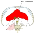central tendon ドーム状の横隔膜の中央部で、3つの部の停止部となっているところ。三つ葉型をして、色々な方向に走っている腱束でできている。腰椎部に近いところ(およそ第8胸椎の高さ)に大静脈孔が開いている。 |