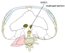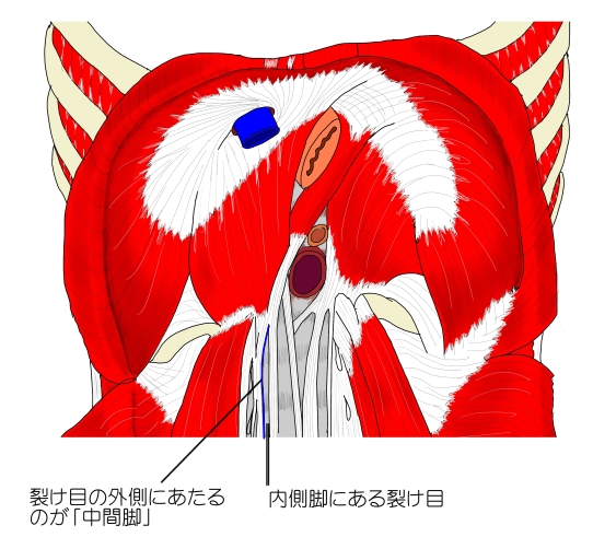 腰椎部の右脚と左脚が作る2つの裂孔のうちの一つで、食道と迷走神経が貫通している。 |
