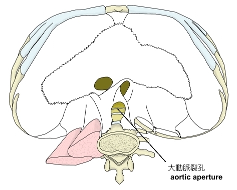 腰椎部の右脚と左脚が作る2つの裂孔のうちの一つで、右脚と左脚が第1腰椎の上縁で交叉してできる孔。下行大動脈と胸管が通っている。 |