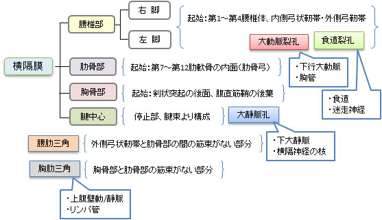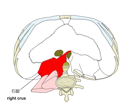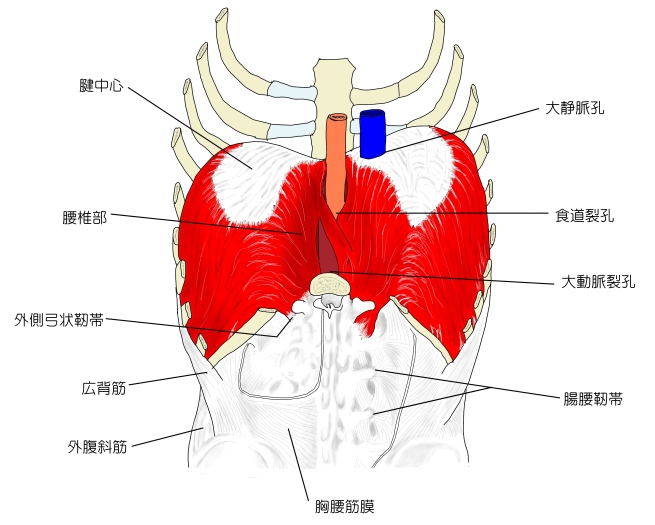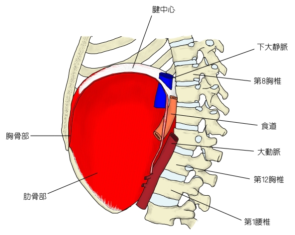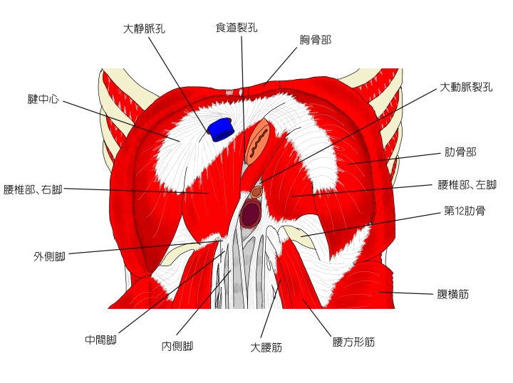 ( 右脚、 外側脚、 外側弓状靭帯、 胸肋三角、 左脚、 食道裂孔、 大静脈孔、