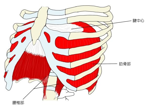 胸腔と腹腔の境界となる膜状の筋で、ドーム状を呈し、以下の4部より構成される。