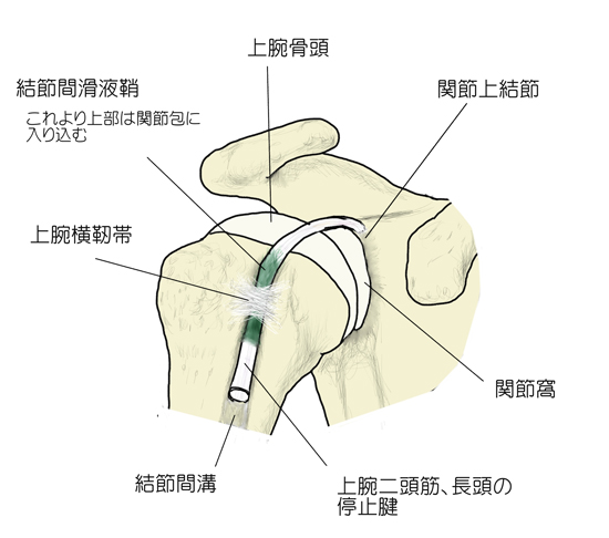 上腕ニ頭筋、長頭の腱 (英:tendon of long head of biceps) (muscles) 「肩甲骨の関節上結節から起こり、肩関節包内で上腕骨頭の上に沿って外側方に走り、ついで下方に向かって結節間溝中に入り、結節間滑液鞘に包まれ関節腔を出て筋腹に移行する」「日本人体解剖学」(南山堂)P301 【他の参考になるサイト】 ・解剖学的写真を掲載したサイト ①上腕ニ頭筋の停止腱、上腕横靭帯が確認できる写真(上腕骨頭は関節窩から外れていると思われる) ②上腕ニ頭筋の停止腱の関節窩への停止部分が確認できる(Ⅰ) ③上腕ニ頭筋の停止腱の関節窩への停止部分が確認できる(Ⅱ) ④縦断面のMRI画像(Ⅰ) ⑤縦断面のMRI画像(Ⅱ) ⑥CGイラスト