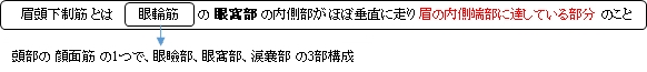 眼窩部 ( Pars orbitalis ) はもはや眼瞼には属していない部分である.これは眼瞼部よりも厚くて,いっそう濃い色をしており,さらに太い筋束をもっている.上眼瞼の周りにある部分は扇形に広がり,しかもその程度も強いので,内側の線維はほとんど垂直に上方へすすみ眉の内側端部に達している.これが 眉頭下制筋 ( M. depressorcapitis supercilii ) であるが,一方ほかの線維は外側にあるものほどいっそう垂直からはなれた方向をとっている. 」