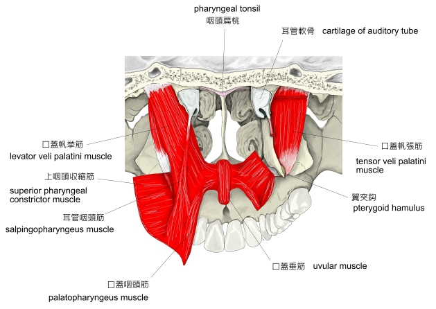 - ・ origin : posterior border of the hard palate and the posterior nasal spine of the horizontal plate of the