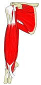 ・ 背部からみると羽根状の扁平のような筋に見えるが、筋腹は厚く、中央には腱が上腕骨頭へと走っている。