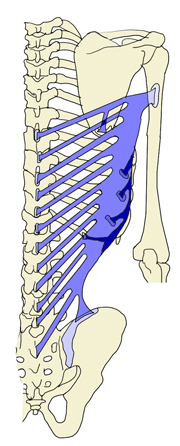 The latissimus dorsi is responsible for extension, adduction, transverse extension also known as horizontal abduction, flexion from an extended position, and (medial) internal rotation of the shoulder joint.[citation needed] It also has a synergistic role in extension (posterior fibers) and lateral flexion (anterior fibers) of the lumbar spine, and assists as a muscle of both forced expiration (anterior fibers) and an accessory muscles of inspiration (posterior fibers).[6]