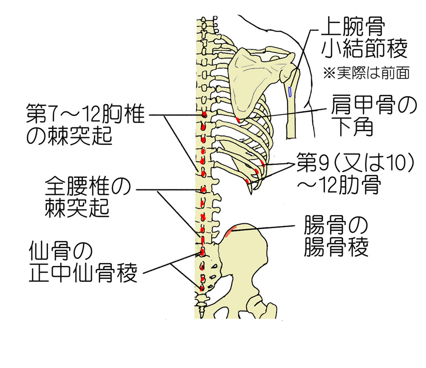 ・腸骨稜 ・第9(又は10)~12肋骨 ・肩甲骨の下角(一覧表6番)