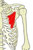 ・肩甲骨の外側(外側角周辺)を斜め下方(起始のある肋骨方向)に引く。