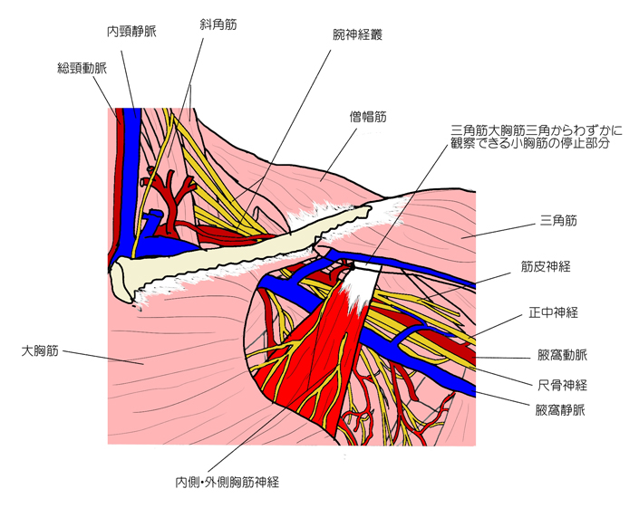 ・ 小胸筋の下を 腕神経叢、腋窩動脈、腋窩静脈 が通っている。 ⇒ イラスト