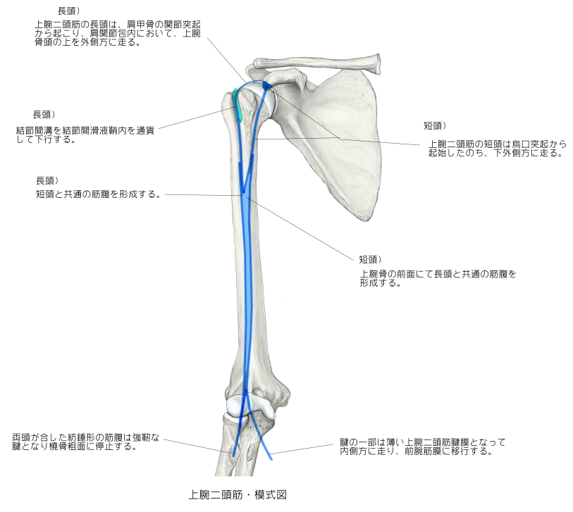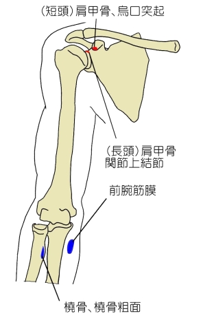 共通の腱は接続して橈骨粗面に終わるが、一部は上腕ニ頭筋腱膜となって前腕筋膜まで及んでいる。