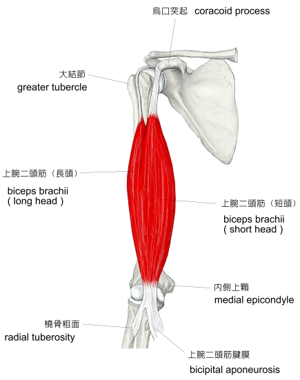 「 長頭は前腕を外転し、短頭は前腕を内転する。上腕二頭筋が全体として働くときは前腕を屈曲し、回外する。 」 ( 日本人体解剖学 )