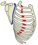 The serratus anterior is a muscle that originates on the surface of the 1st to 8th ribs at the side of the chest and inserts along the entire anterior length of the medial border of the scapula. The serratus anterior acts to pull the scapula forward around the thorax. The muscle is named from Latin: serrare = to saw, referring to the shape, anterior = on the front side of the body.