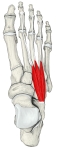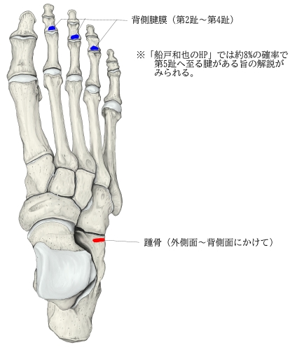 【 停 止 】: 第2から第4趾の背側腱膜 (それぞれの腱が長趾伸筋の腱と合して背側腱膜へ移行)