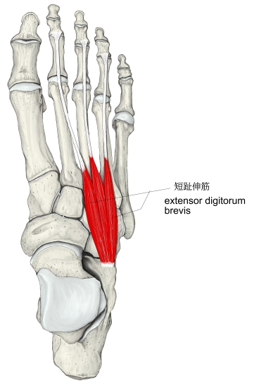 「短趾伸筋は踵骨の上端および下伸筋の支帯より起こり第2~4趾、ときには第2~5趾(約8%)の背側腱膜へ至る。この筋の4本の腱はいずれも前内側に進むが、そのうち最内側のもの(ときに 短母指伸筋腱 extensor hallucis brevis tendon ともよばれる) は第1趾の基節底に停止する残りの3本の腱はそれぞれ第2,第3、第4趾に向かう長指伸筋腱への合流を示す。短趾伸筋は深腓骨神経の支配を受ける。この筋は第1~4趾を伸展させる。この筋の作用は距腿関節で足が背屈して長指伸筋が動けない状態下で特に顕著となる。」
