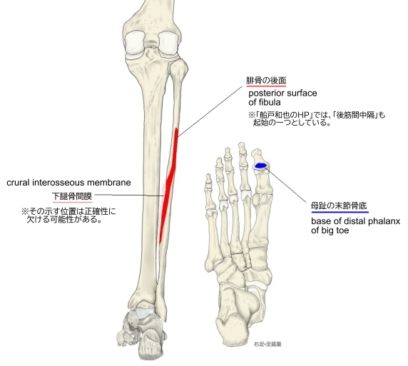 「長母趾屈筋はずっと内側に(おもな腱は第1末節骨底に)停止する。その起始は下腿の外側、つまり腓骨後面の遠位2/3,骨間膜の狭い紐状部分および後筋間中隔である。その腱は長趾屈筋腱の下を横切り(足底腱交叉)、足底で第2および第3(まれに第4)趾末節骨に腱性停止を送る。距骨後面と載距突起下面において長母趾屈筋の腱は溝の中を走る。同筋は腱鞘に包まれる。腱鞘は内果先端のレベルにはじまり、遠位へ伸び、第1中足骨底に至る。停止腱は第1中足骨頭から末節骨に至るまで腱鞘に包まれている。腱鞘は線維性のおおいによって母趾の各分節に付く。」